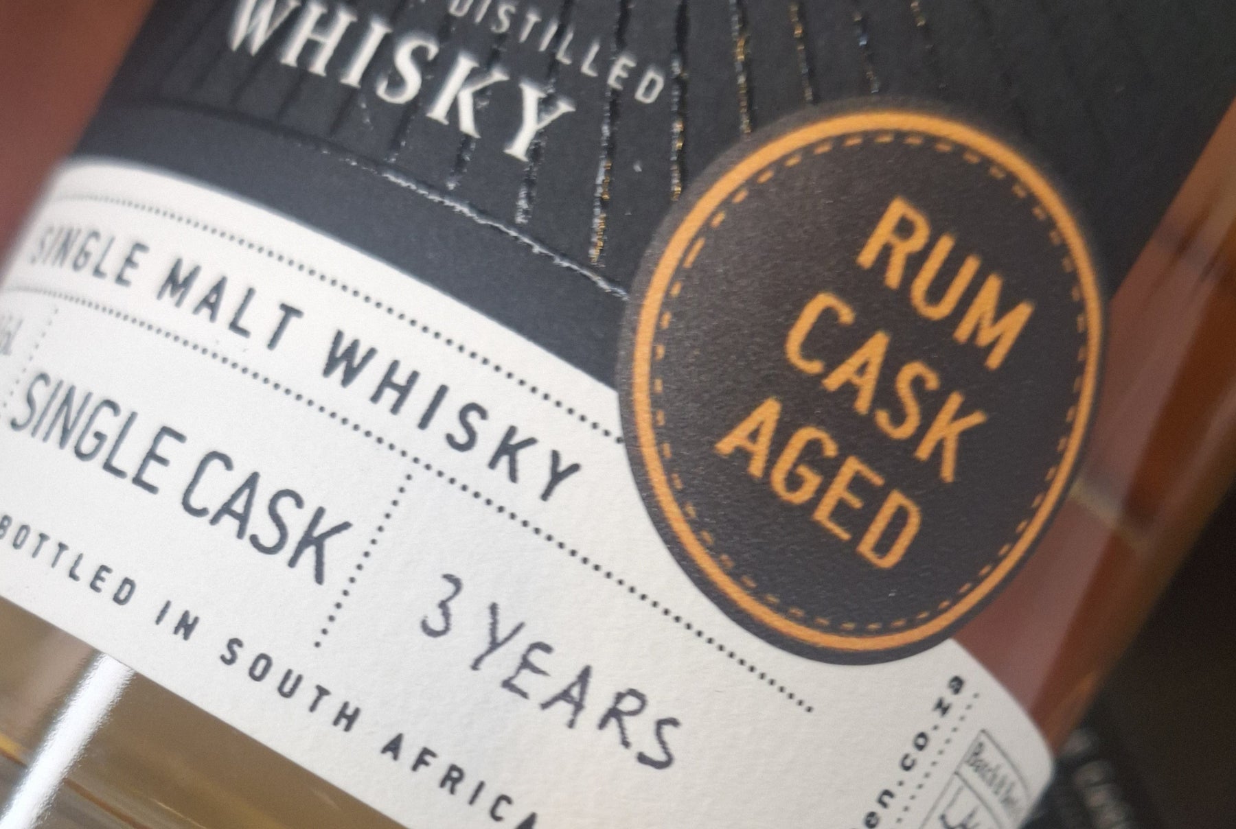 Close-up of a whisky label with 'Rum Cask Aged' text.